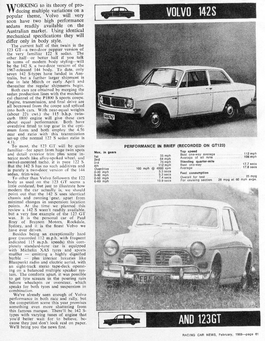 "The Volvo 123GT is not the cheapest high-performance car in Australia; and it's not the fastest. It may be one of the most economical, it's almost certainly the most durable and it's likely the best all-rounder....." ( Sports Car World magazine Road Test February 1968)